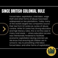 Today, tea plantations are run by companies that lease land from the government. Their schools remain underfunded compared to the national Sri Lankan education system, with declining resources and high dropout rates. Cycles of exploitative violence continue, with communities reporting high rates of abuse, underpaid child labor, wage theft, and even forced labor.